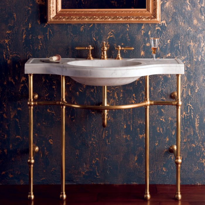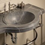 Traditionally fabricated with a porcelain basin and stone countertop, this classic vanity sink is carved from a single block of honed marble. Combine the subtle detailing of the washbasin with traditional console legs in aged brass or polished nickel, and bring a new “old world” feel to the bath.